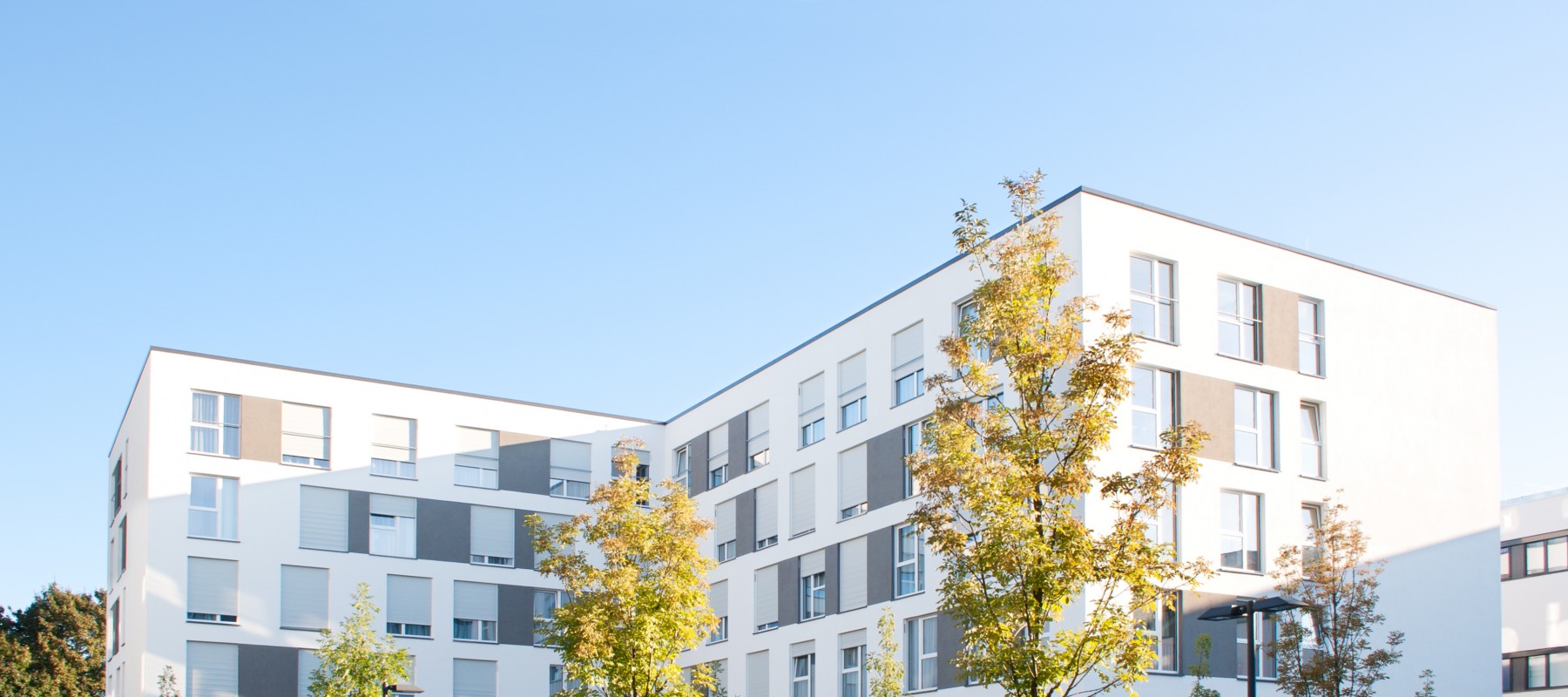 Um nicht in Konkurrenz zu den FIZ-Gebäuden zu treten wurde eine zurückhaltende und dezente Fasssadengestaltung mit großflächigen französischen Balkonen und farbig abgesetzten Fensterspiegeln gewählt.