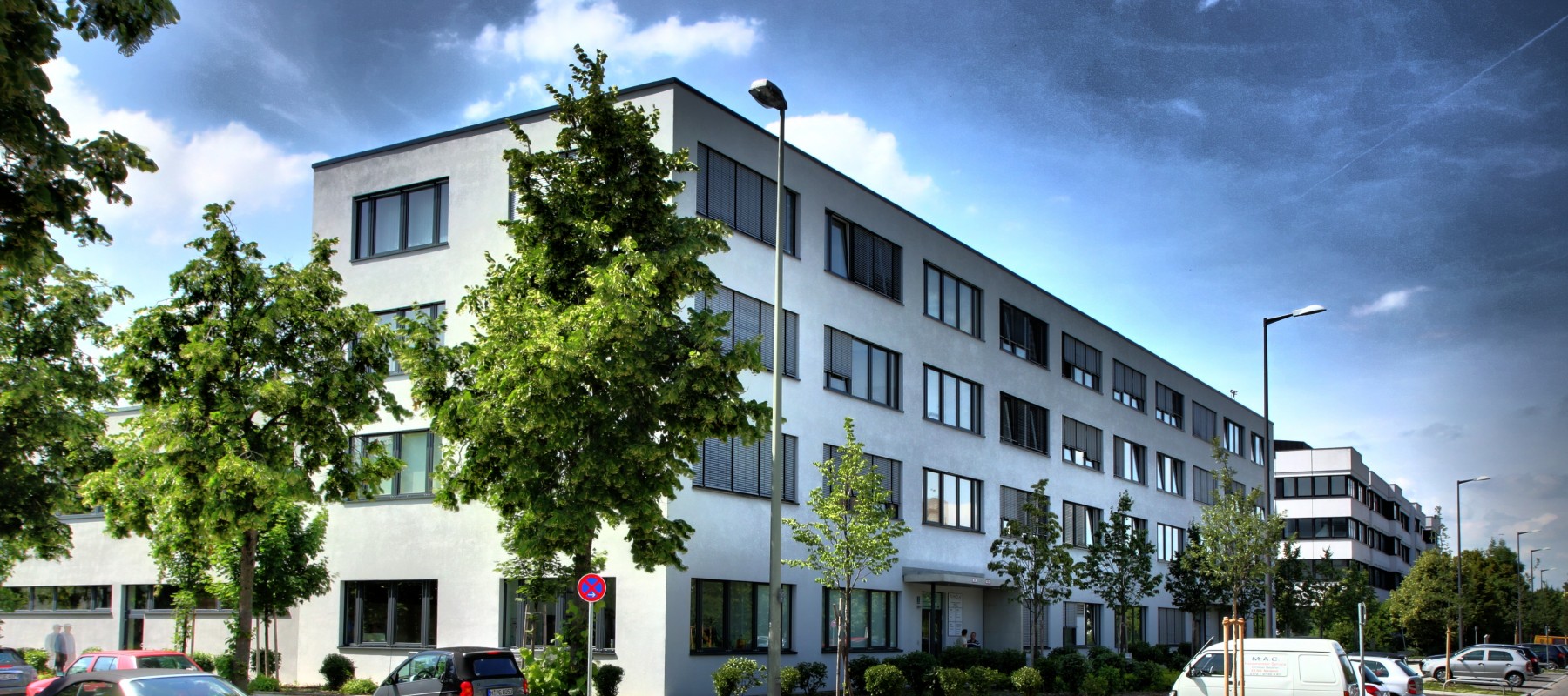 Das Hybridgebäude umfasst einen 4-geschossigen Verwaltungsbau sowie einen zwei geschossigen Produktions- und Prüfbereich.