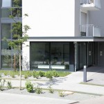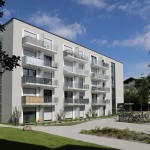 Die Fassade zur lärmintensiven Bahnstrecke wurde mit liegenden Fensterbändern und vorgelagerter Flurzone als Schallschutzpuffer zu den Appartements ausgeführt.