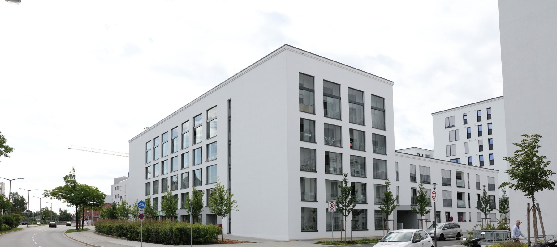Das Gebäude ist mit seiner Lochfassade streng aufgegliedert und schließt mit stilisierter Gesimsausbildung weich zur Umgebung ab. Durch seine schlichte Eleganz und der ausgearbeiteten Detailausführung hebt sich das Gebäude an der Straubinger Straße von dem restlichen Straßenzug ohne zu dominieren ab und gibt dem gesamten Neubaugebiet eine Adresse zur Straubinger Straße.